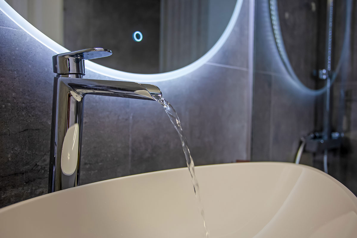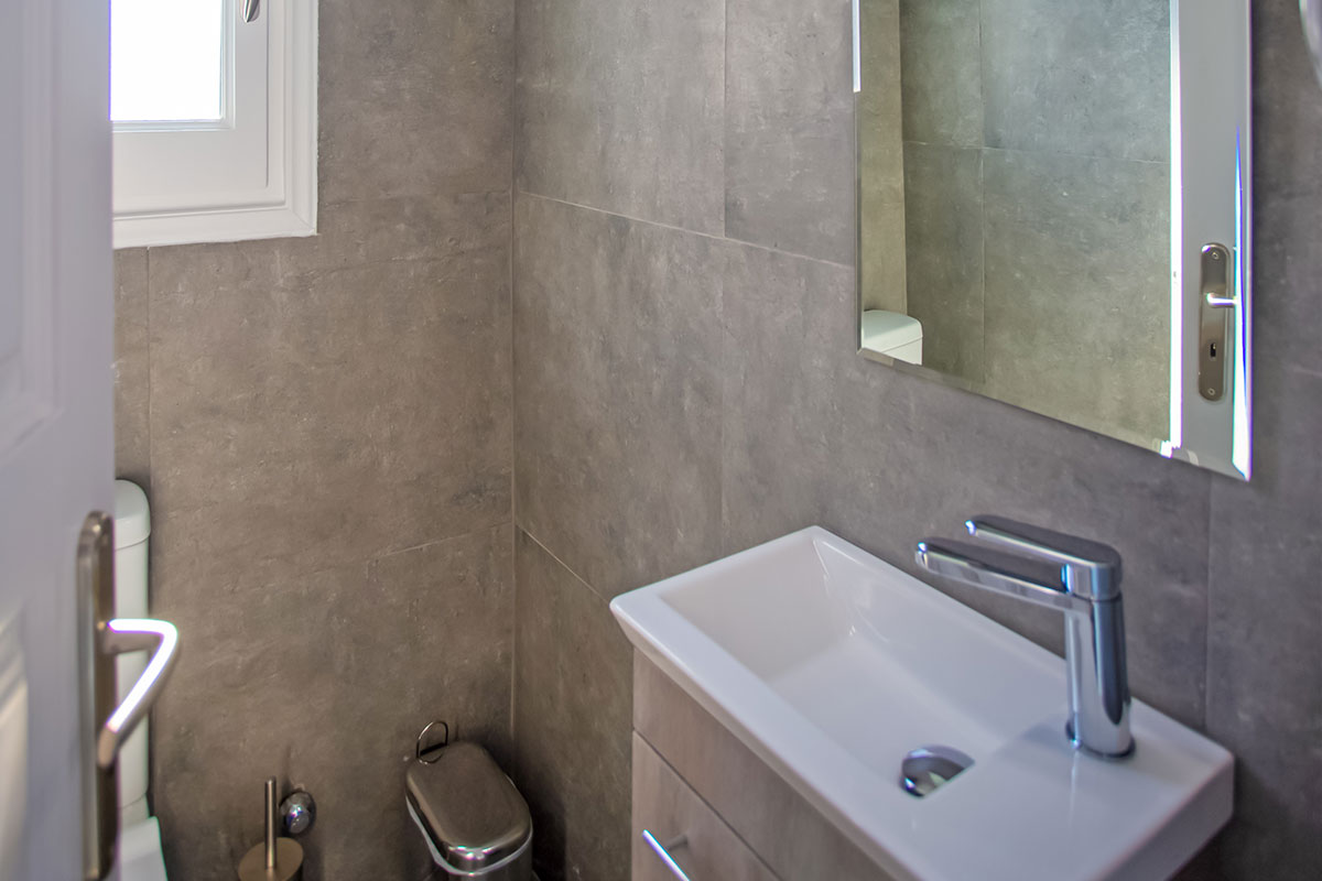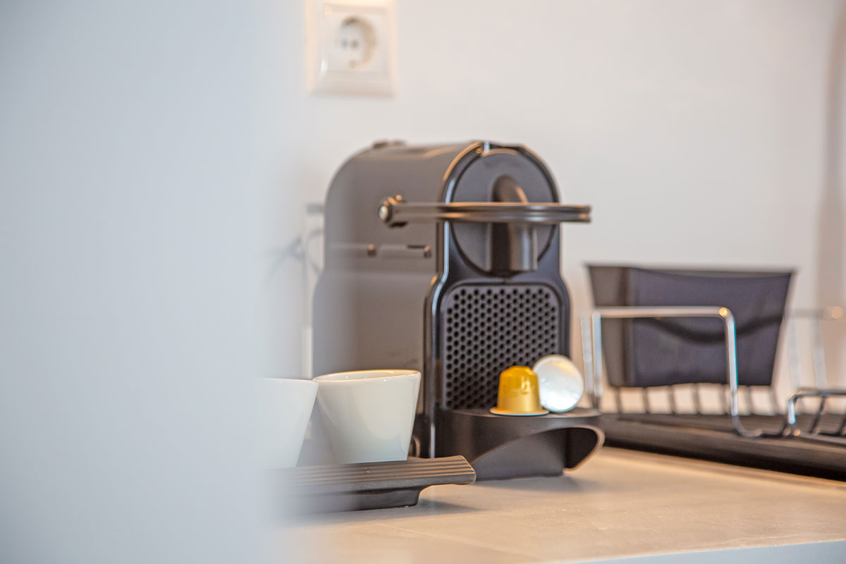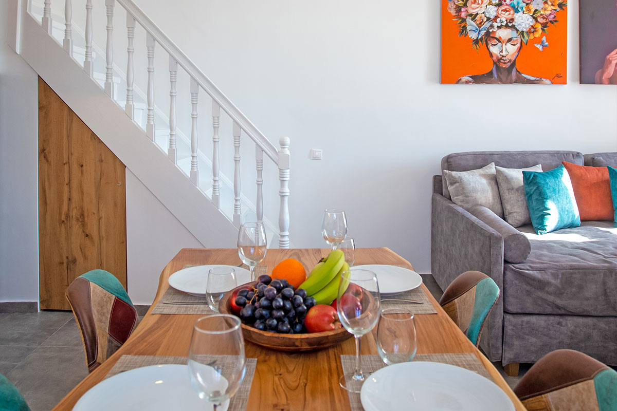 The interior is split over two levels. The first floor, featuring a modernly furnished living room with a minimal-boho feel and bonny decorative details, a stylish open plan, fully equipped kitchen and a large, double sofa suitable for sleeping. On the upper floor, guests will find a beautifully styled bedroom complete with chic fitments, a spacious open wardrobe and the nicely shaped bathroom featuring modish accessories.