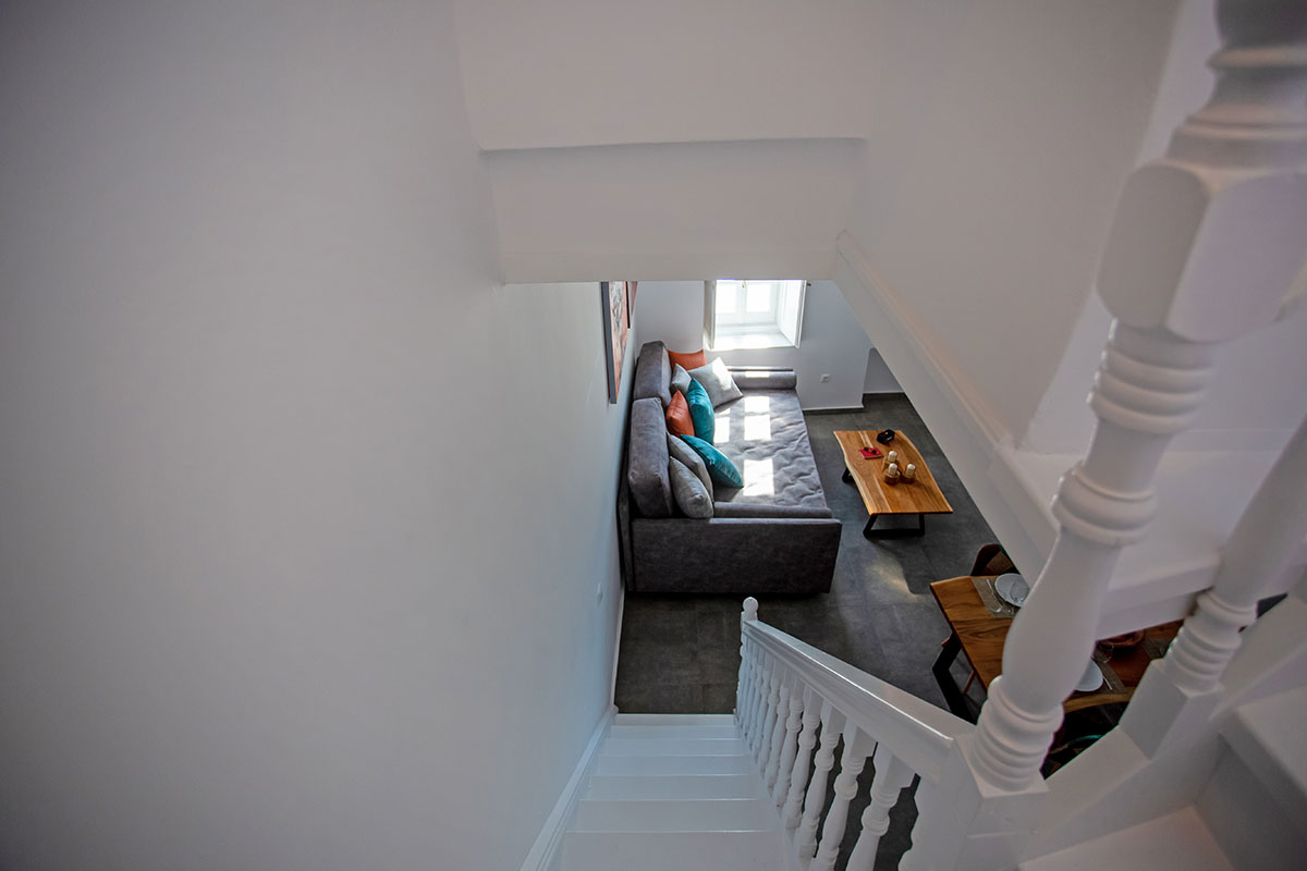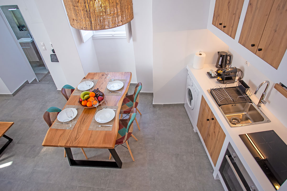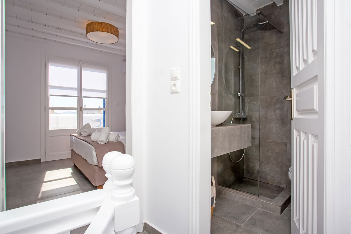 As guests enter the property, they will be charmed by the traditional Mykonian wooden staircase that leads up to the main entrance. This unique feature gives a sense of privacy and seclusion from the bustling streets below.